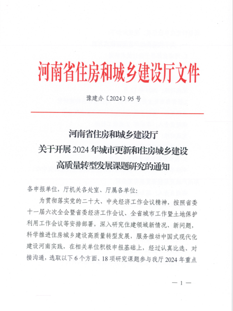 根據(jù)省委十一屆六次全會暨省委經(jīng)濟工作會議、全省城市工作暨土地保護(hù)利用工作會議等安排部署,河南省住房和城鄉(xiāng)建設(shè)廳開展2024年城市更新和住房城鄉(xiāng)建設(shè)高質(zhì)量轉(zhuǎn)型發(fā)展課題研究,經(jīng)過省住房和城鄉(xiāng)建設(shè)廳認(rèn)真比選、對接溝通,我公司有兩個課題入選,分別為城市更新研究中心負(fù)責(zé)人李鵬牽頭開展的課題《河南省既有建筑及市政設(shè)施工程體檢研究》和建筑消防與結(jié)構(gòu)安全研究所所長田野牽頭開展的課題《河南省既有建筑改造工程消防設(shè)計審查驗收研究》。