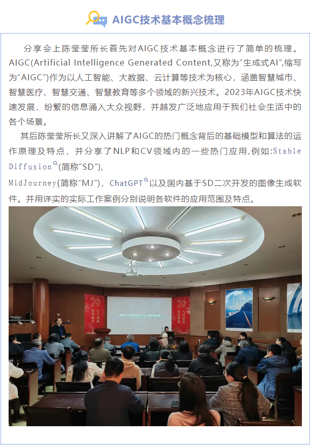 近日,由第一設(shè)計(jì)分院設(shè)計(jì)三所所長(zhǎng)陳瑩瑩、景觀規(guī)劃所所長(zhǎng)張璇、第九設(shè)計(jì)所建筑設(shè)計(jì)師曾添琳主講的“AIGC技術(shù)在建筑設(shè)計(jì)的應(yīng)用”主題分享會(huì)在公司二樓報(bào)告廳成功舉辦。