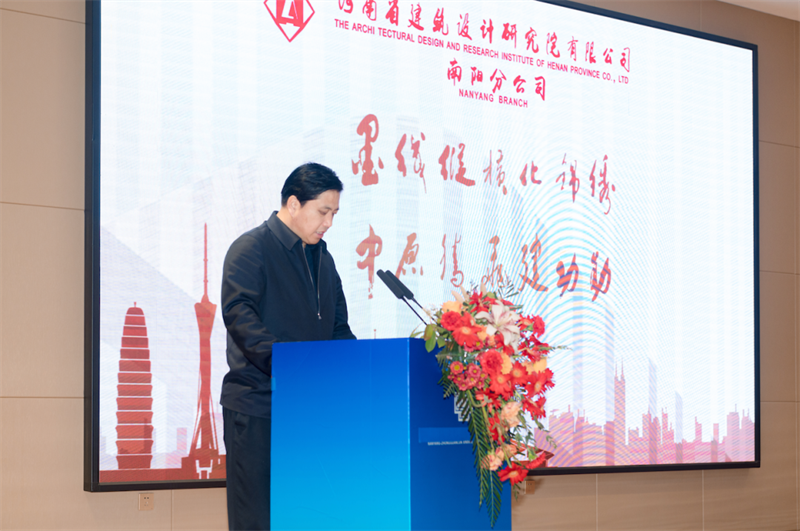 河南省建筑設(shè)計研究院有限公司董事長安杰、總經(jīng)理張映珍致詞,宣讀任命文件并向南陽分公司總經(jīng)理陳春強(qiáng)頒發(fā)聘書,共同寄語南陽分公司在新的征途上踔厲奮發(fā)、篤行不怠,不斷開拓創(chuàng)新,再繪宛城新藍(lán)圖。