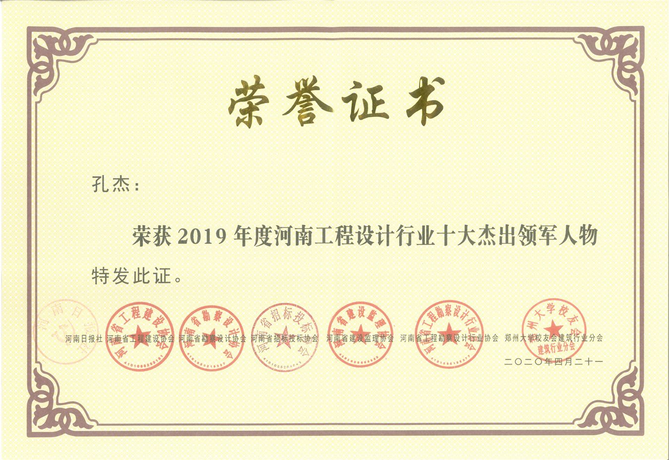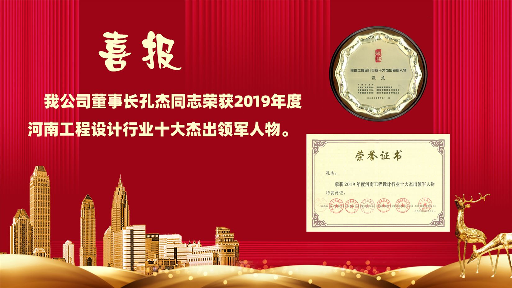 董事長孔杰同志榮獲2019年度河南工程設(shè)計行業(yè)十大杰出領(lǐng)軍人物
