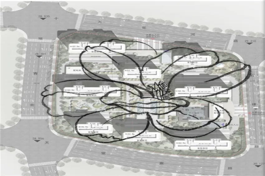 本項(xiàng)目將象征著高貴典雅的玉蘭花融入到規(guī)劃設(shè)計(jì)中,中央景觀花園就像玉蘭花的花蕊,圍合的住宅樓就像玉蘭花的花瓣,整體規(guī)劃勾勒出一個(gè)巨大的玉蘭花形態(tài),體現(xiàn)出高端典雅的設(shè)計(jì)調(diào)性。