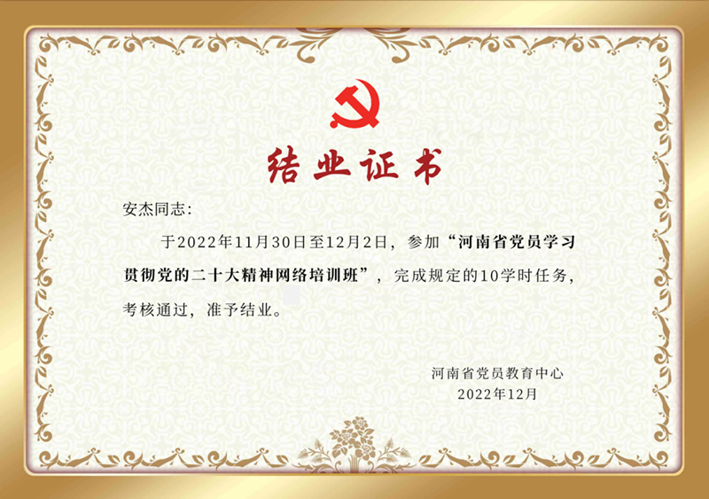 本次培訓(xùn)以“線上授課+在線考試”的形式開(kāi)展,公司黨委書(shū)記、董事長(zhǎng)安杰率先垂范參加培訓(xùn),引領(lǐng)帶動(dòng)各支部黨員干部通過(guò)河南黨員教育服務(wù)網(wǎng)、“黨員教育云課堂”小程序積極參加,深入學(xué)習(xí)習(xí)近平總書(shū)記視察陜西延安和河南安陽(yáng)重要講話精神、新時(shí)代十年的偉大變革等專題內(nèi)容,完成黨的二十大精神應(yīng)知應(yīng)會(huì)知識(shí)測(cè)試,獲得網(wǎng)絡(luò)培訓(xùn)的結(jié)業(yè)證書(shū)。