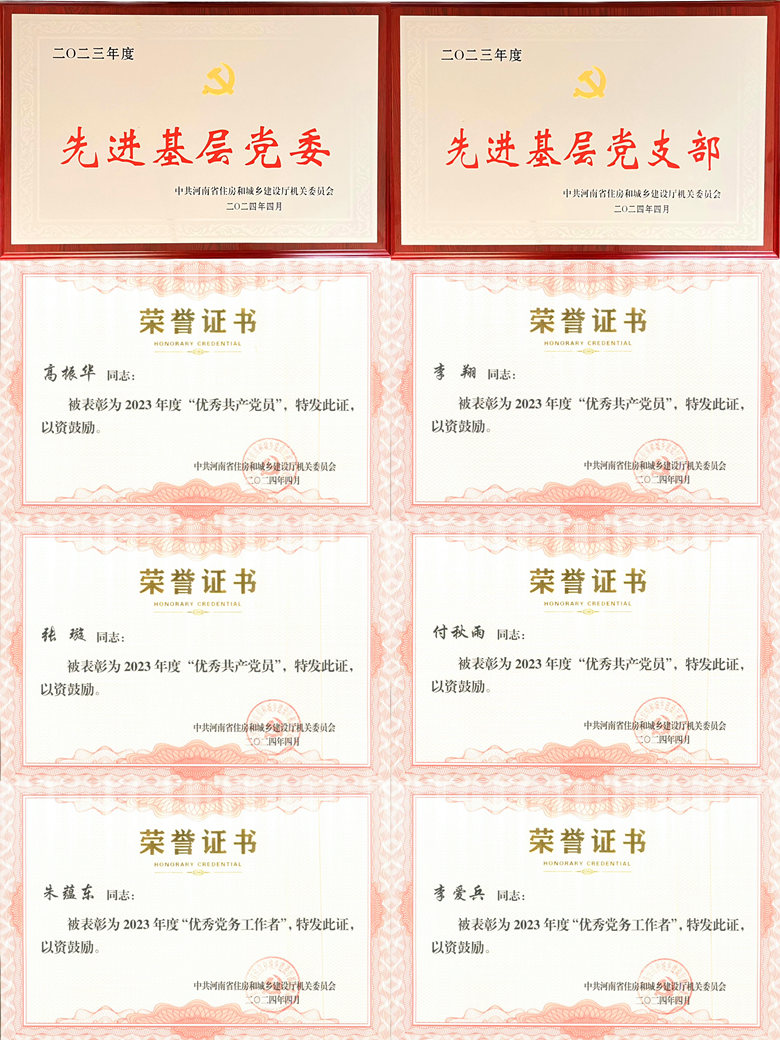 根據(jù)中共河南省住房和城鄉(xiāng)建設(shè)廳機(jī)關(guān)黨委印發(fā)《關(guān)于表彰2023年度優(yōu)秀共產(chǎn)黨員、優(yōu)秀黨務(wù)工作者和先進(jìn)基層黨組織的通報(bào)》(豫建機(jī)黨〔2024〕16號),河南省住房和城鄉(xiāng)建設(shè)廳直屬機(jī)關(guān)工會(huì)印發(fā)《關(guān)于表彰2023年度廳直工會(huì)工作先進(jìn)集體和先進(jìn)個(gè)人的通報(bào)》(豫建工直〔2024〕1號),我公司黨委及員工獲得表彰。