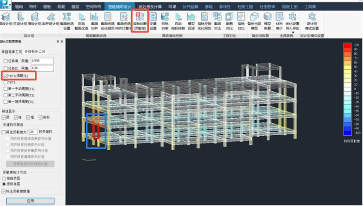 如圖4所示,經(jīng)過靈敏度分析,程序非常快速找到了對于整體指標(biāo)影響至關(guān)重要的構(gòu)件,本次僅挑選靈敏度數(shù)值為100的框架梁進(jìn)行調(diào)整。由于1層是拉梁層,梁截面調(diào)整空間較大,原始梁截面為350x600,先嘗試調(diào)整為350x900,計算后周期比為0.9013,仍超限;再次調(diào)整梁截面為400x1000,計算后周期比為0.898,調(diào)整通過。單次模型計算耗時約2min,累計耗時5min完成超限指標(biāo)調(diào)整通過。