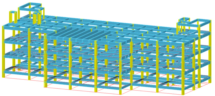 某多層鋼筋混凝土框架結(jié)構(gòu)體檢樓,抗震設(shè)防烈度6度,設(shè)計基本地震加速度峰值為0.05g,設(shè)計地震分組第一組,Ⅱ類場地,Tg=0.35s,B類地面粗糙度;地上3層,建筑高度13.2m,主要層高4.5m、4.2m、4.2m,長56.2m,寬18.2m;設(shè)計工作年限50年,基本風(fēng)壓(50年一遇)為0.40kN/m2,建筑安全等級為一級,屬于重點設(shè)防類建筑。圖1為工程結(jié)構(gòu)模型示意圖,圖2為1~3及屋面層結(jié)構(gòu)平面布置圖,小屋面不再示意。