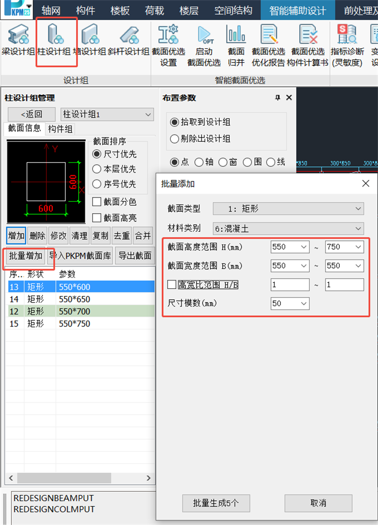 如圖4所示對紅色構(gòu)件進(jìn)行手動分組,梁和柱分別一個設(shè)計組,柱設(shè)計組包含1-2層該位置柱,并設(shè)置設(shè)計組備選截面為設(shè)計組調(diào)整策略做準(zhǔn)備,見圖5。