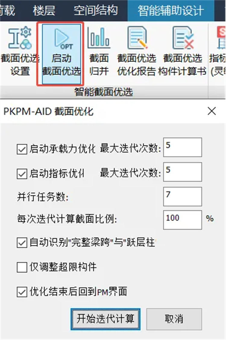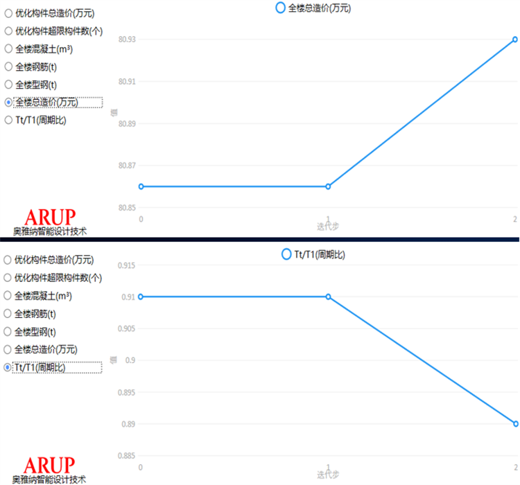 AIDV2.0實現(xiàn)了“構(gòu)件+指標(biāo)”同步雙控,截面優(yōu)化同時保證指標(biāo)滿足,即通過首創(chuàng)的獨(dú)有算法,充分考慮多種因素,確保優(yōu)化后的截面能使重要指標(biāo)(位移、周期、剛度等)保持在合理范圍內(nèi),達(dá)到最優(yōu)造價消滅超限的同時,減少因指標(biāo)問題導(dǎo)致的設(shè)計返工,提高設(shè)計效率。算法深度優(yōu)化后,迭代次數(shù)降至個位數(shù),同時降低對設(shè)計組劃分的依賴。常規(guī)項目單模塊即可完成優(yōu)化,高級指標(biāo)模塊仍保留專業(yè)調(diào)控功能。