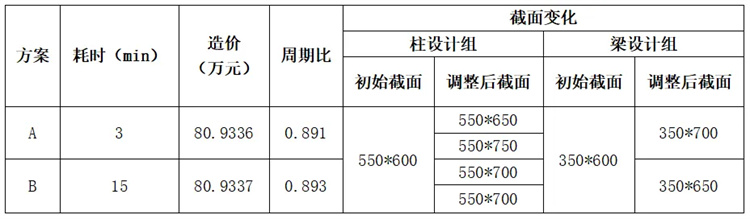 采用AIDV2.0智能截面優(yōu)選功能自動調(diào)整超限指標(biāo)通過為方案A,采用高級指標(biāo)控制功能自動調(diào)整超限指標(biāo)通過為方案B。不同方案優(yōu)化效果對比見表1,可以看到AID2.0優(yōu)化效率提升了400%,優(yōu)化效果中造價和周期比指標(biāo)相對也更優(yōu)一些。