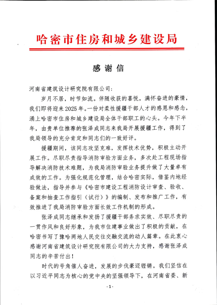 河南省院收到了新疆哈密市住房和城鄉(xiāng)建設(shè)局發(fā)來的感謝信,信中對河南省院高度重視援疆工作表示衷心感謝,對河南省院援疆人員張澤成所做出的杰出貢獻給予高度評價。