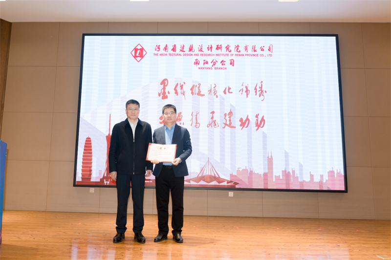 河南省建筑設(shè)計研究院有限公司董事長安杰、總經(jīng)理張映珍致詞,宣讀任命文件并向南陽分公司總經(jīng)理陳春強(qiáng)頒發(fā)聘書,共同寄語南陽分公司在新的征途上踔厲奮發(fā)、篤行不怠,不斷開拓創(chuàng)新,再繪宛城新藍(lán)圖。
