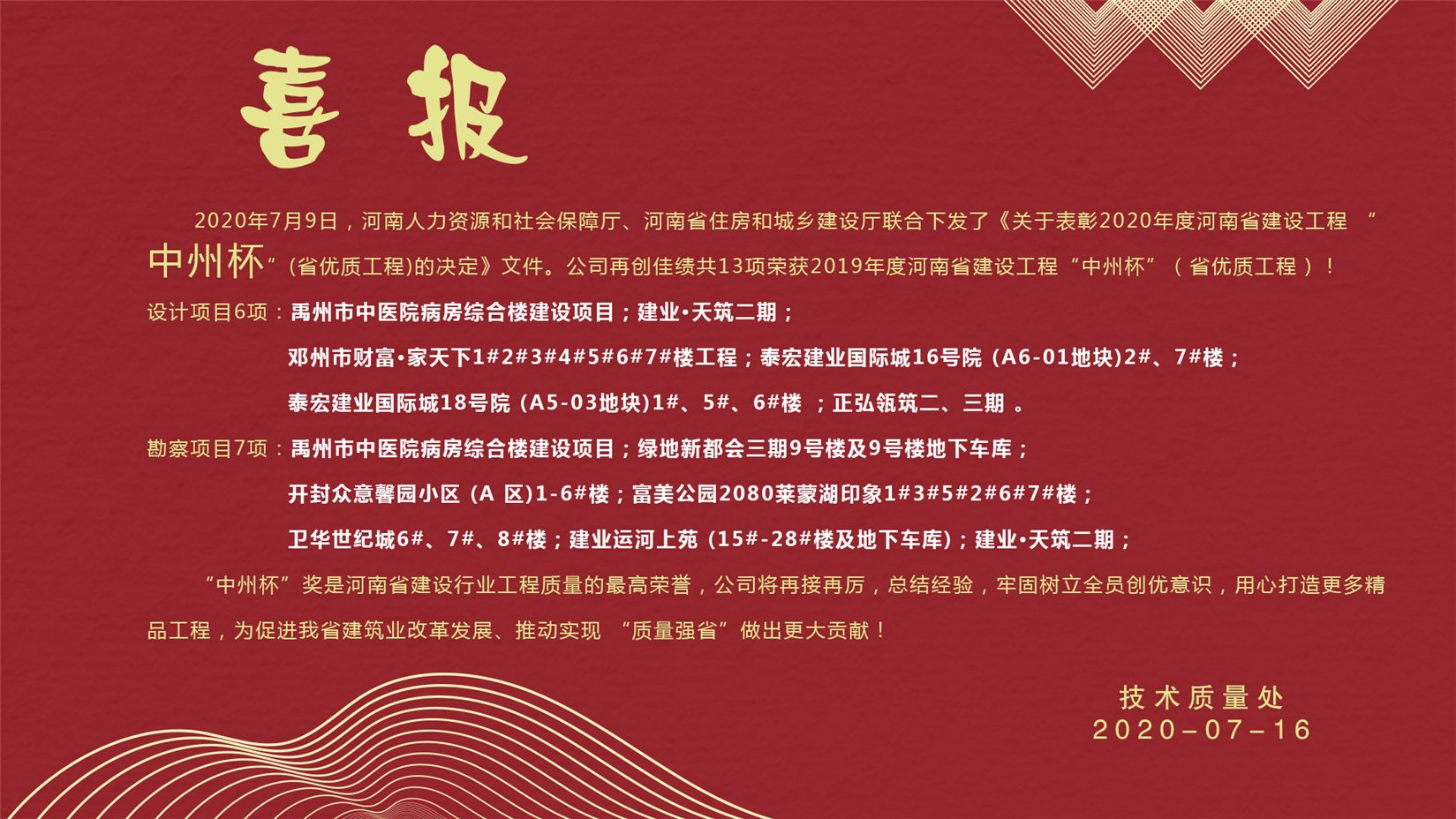 2020年7月9日,河南人力資源和社會保障廳、河南省住房和城鄉(xiāng)建設廳聯(lián)合下發(fā)了《關于表彰2020年度河南省建設工程 “中州杯”(省優(yōu)質工程)的決定》文件。公司再創(chuàng)佳績共13項榮獲2019年度河南省建設工程“中州杯”(省優(yōu)質工程)!
