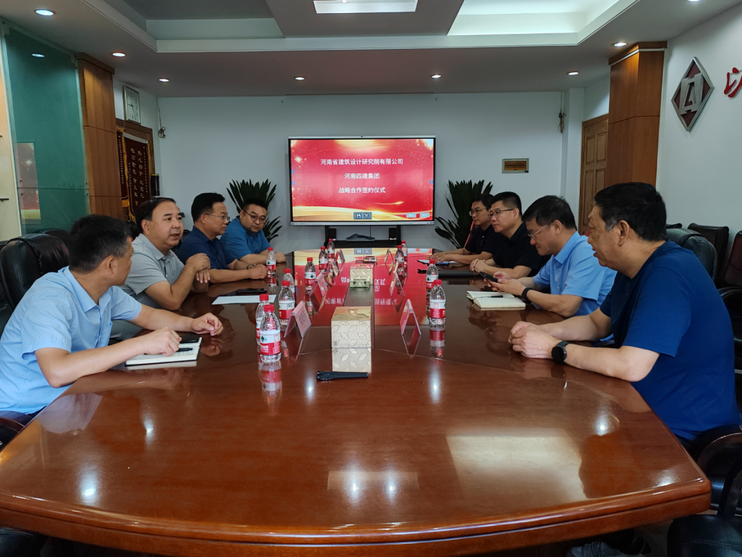 2023年7月18日,河南省建筑設計研究院有限公司與河南四建集團股份有限公司于我公司科研辦公樓聯(lián)袂舉行戰(zhàn)略合作簽約儀式。河南省建筑設計研究有限公司總經理張映珍、南陽分公司總經理陳春強、副總經理樊振東、胡殿彥與河南四建集團股份有限公司總裁賈俊鋒、副總裁代偉、集團總工程師樊曉東、副總工程師張弛作為雙方簽約代表共襄盛舉。