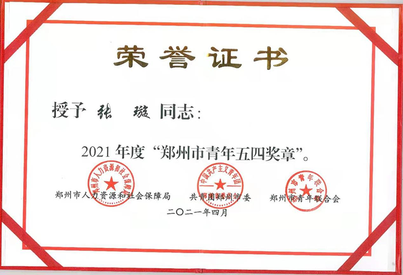 祝賀!張璇獲“鄭州市青年五四獎?wù)隆?/h1> 2021年05月12日
